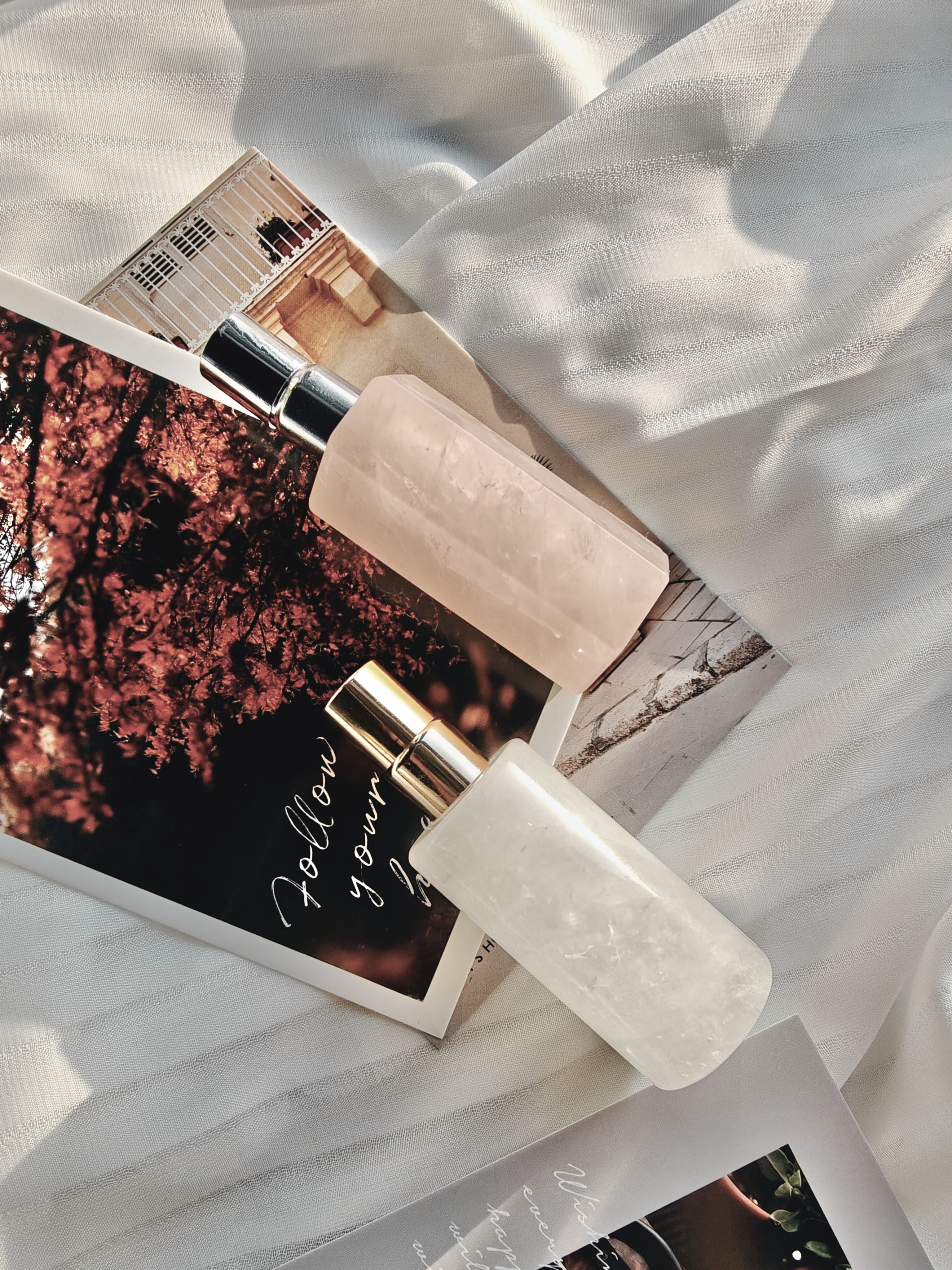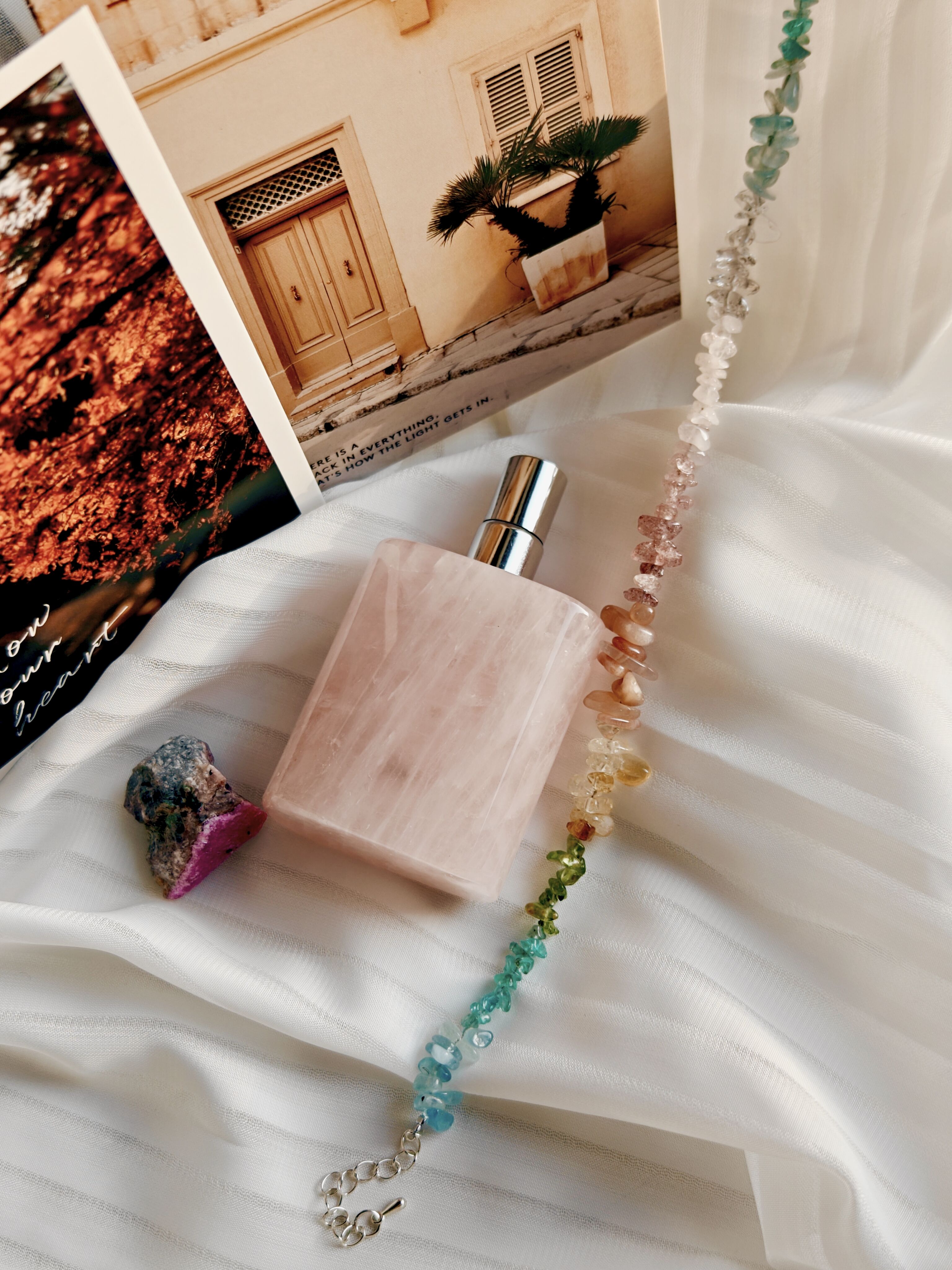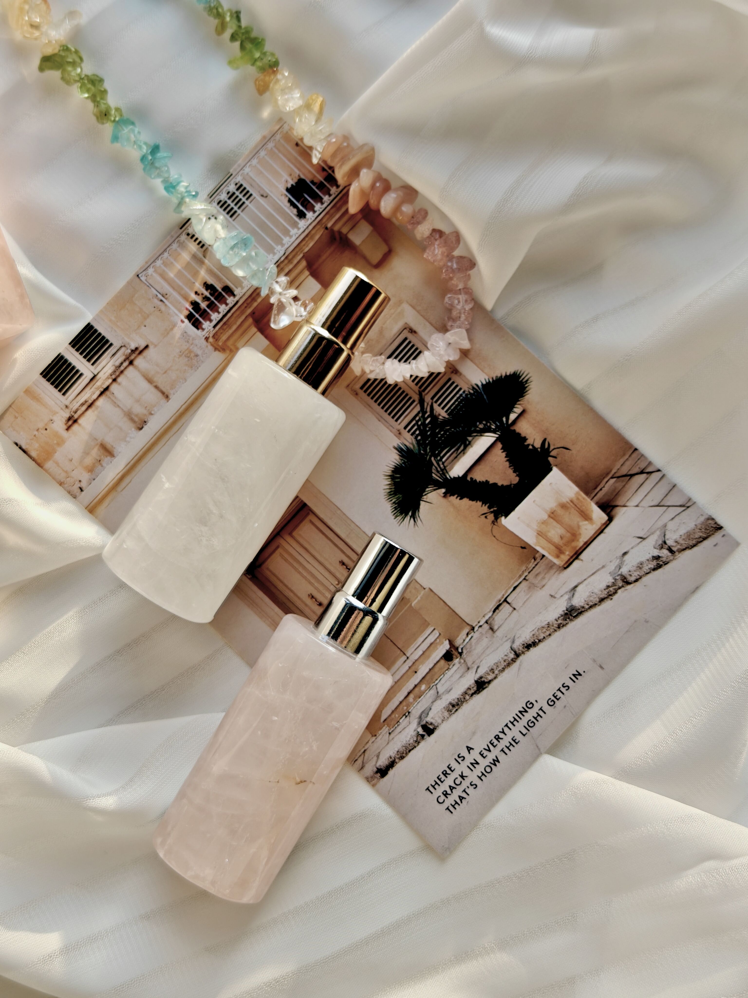 Pink crystal perfume bottle, with facets cut like a gemstone, glows with a soft, hazy light. A silver cap rests atop, making the entire piece a delicate treasure—a whisper of scent held in the palm of your hand.