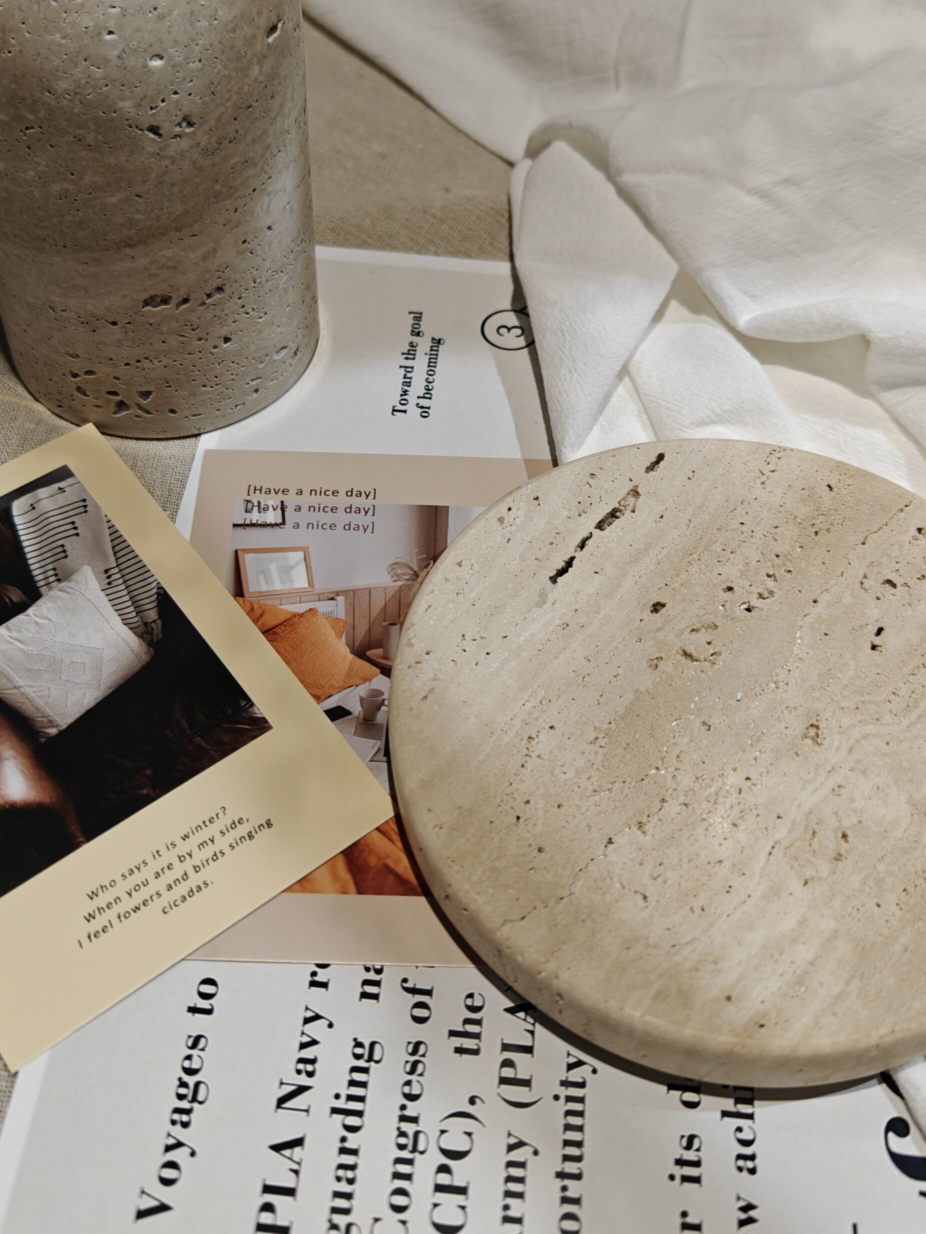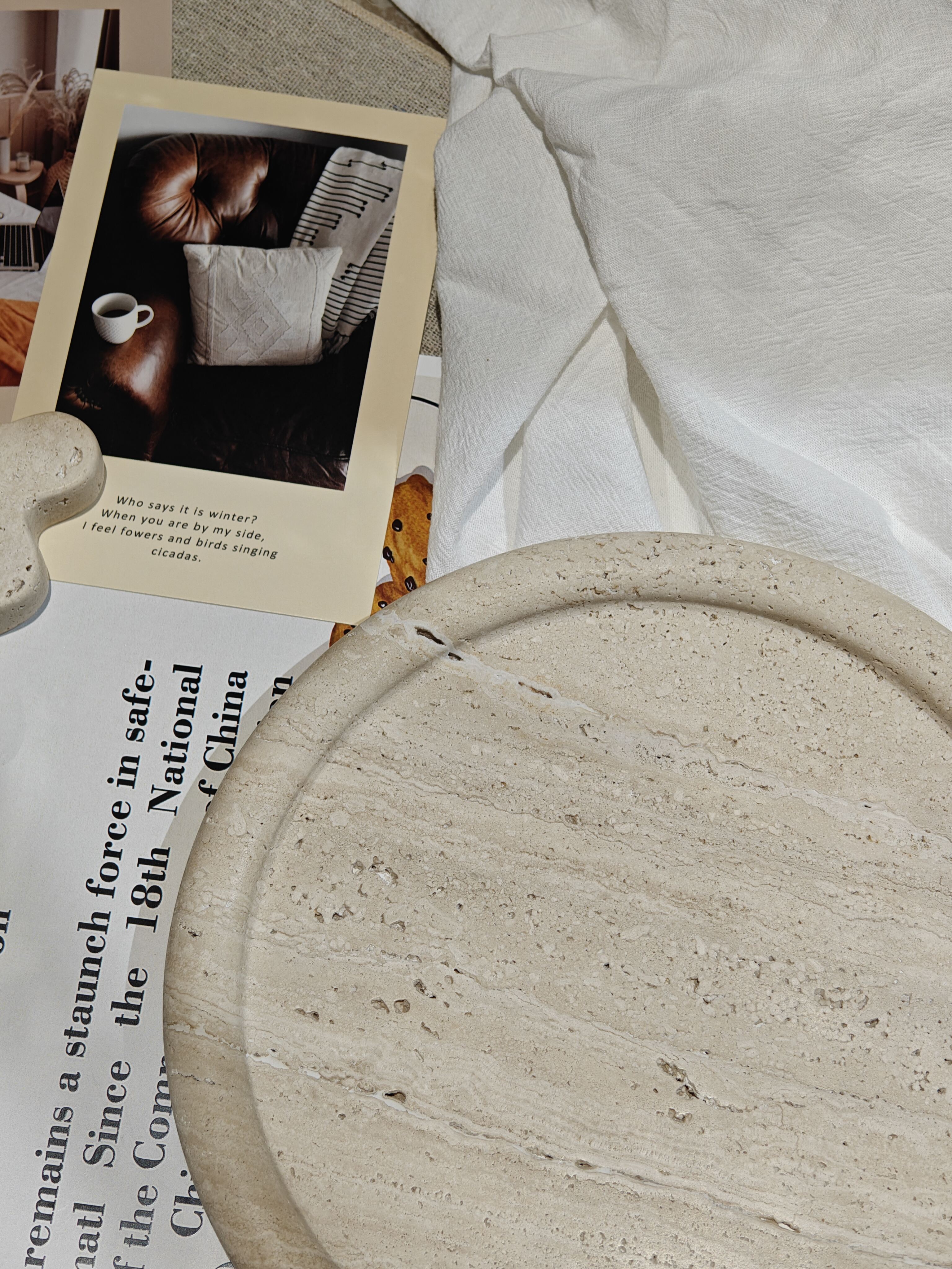 Crafted from a single slab of genuine travertine stone and meticulously finished by hand, its distinctive porous nature offers natural breathability and excellent heat insulation. It effortlessly keeps condensation at bay when serving chilled drinks in summer and protects surfaces from hot teapots or coffee cups in winter. Its sturdy, enduring build provides a reliable stage for your coffee service, ceramic ware, fragrance diffusers, or a curated collection of jewelry and keys.