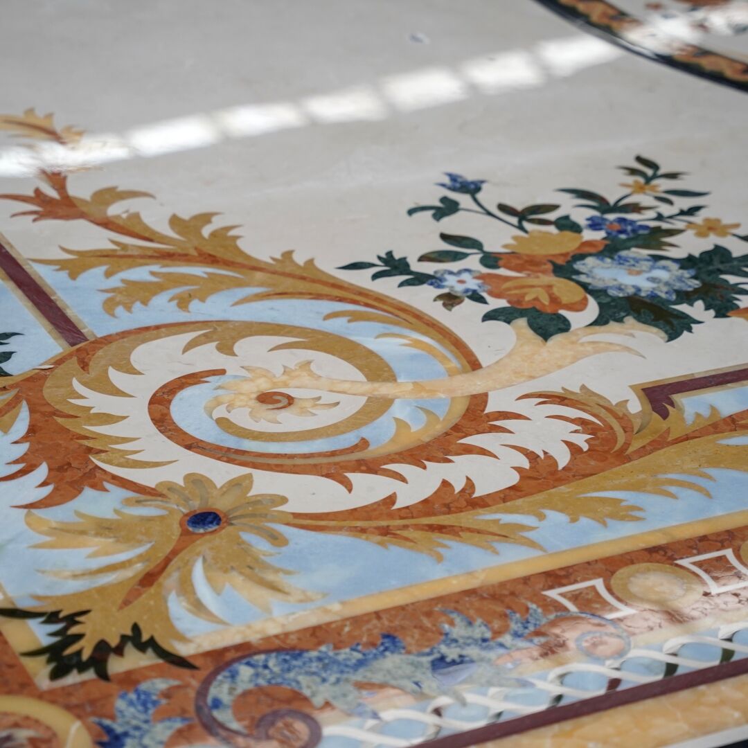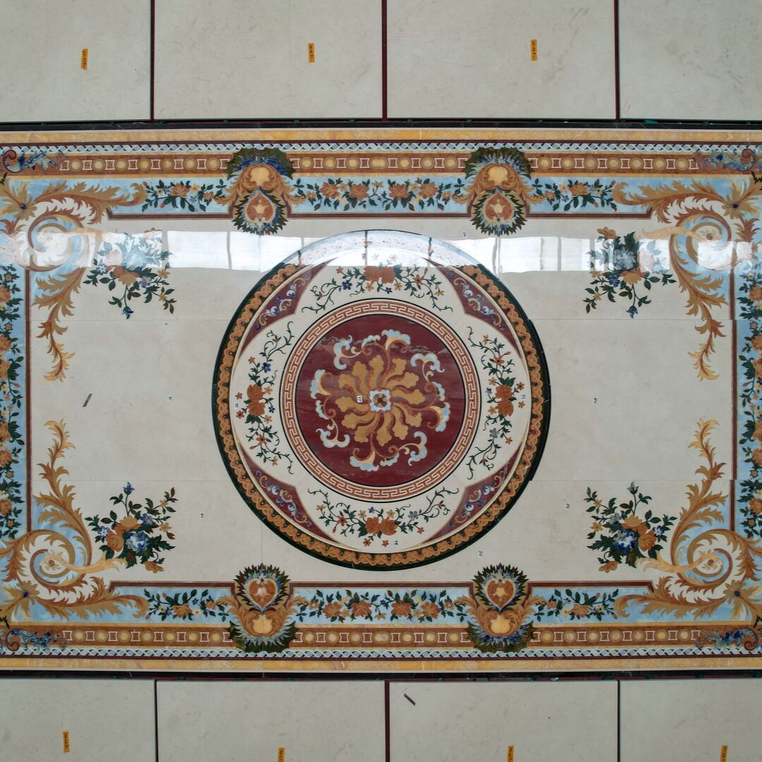The creation process begins with digital design: artists or designers map out detailed patterns (geometric motifs, floral arrangements, custom logos, or classical emblems) using CAD software. Next, high-pressure waterjet cutting machines—equipped with abrasive materials (e.g., garnet) to enhance cutting power—slice natural stone slabs (such as marble, granite, onyx, or travertine) into exact, seamless pieces that match the design. The cut components are then carefully inlaid into a base (often a complementary stone slab or flooring material) and bonded with specialized adhesives, followed by grinding and polishing to create a smooth, unified surface.