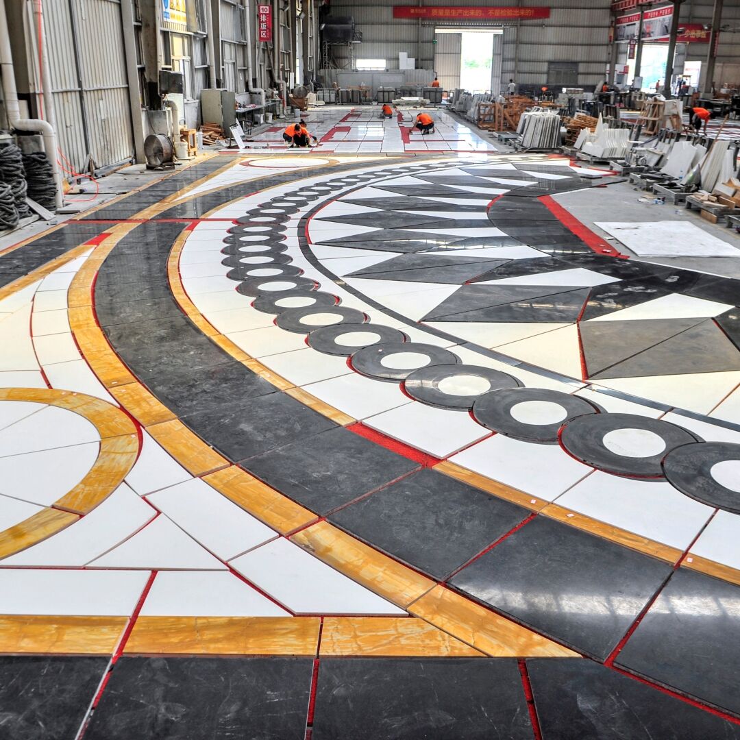 The creation process begins with digital design: artists or designers map out detailed patterns (geometric motifs, floral arrangements, custom logos, or classical emblems) using CAD software. Next, high-pressure waterjet cutting machines—equipped with abrasive materials (e.g., garnet) to enhance cutting power—slice natural stone slabs (such as marble, granite, onyx, or travertine) into exact, seamless pieces that match the design. The cut components are then carefully inlaid into a base (often a complementary stone slab or flooring material) and bonded with specialized adhesives, followed by grinding and polishing to create a smooth, unified surface.